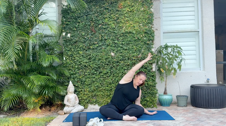 - Sit cross-legged on the mat. Inhale and reach both arms overhead. Exhale and lower your left hand to the mat about 12 inches outside your left hip. Extend your right arm overhead and reach toward the left.