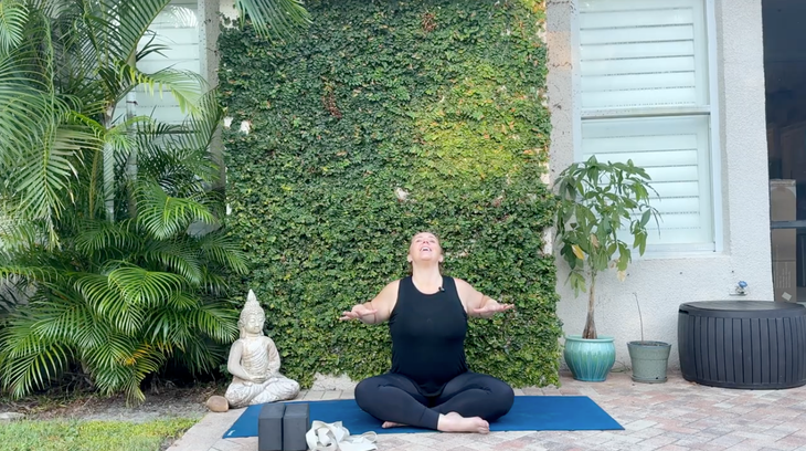 - Sit in a chair or cross-legged on the mat. Exhale as you straighten both arms in front of your chest with your palms facing down. Your upper back may round slightly.