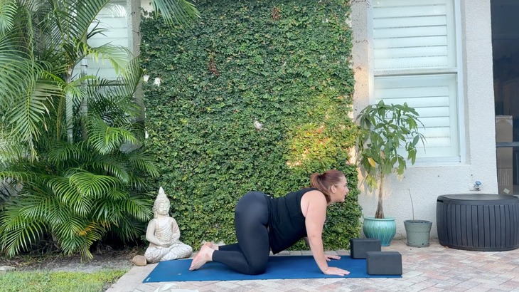 - Exhale as you press your hands into the mat, lower your chin toward your chest, and draw your navel toward your spine in Cat Pose. Repeat 5-6 times.