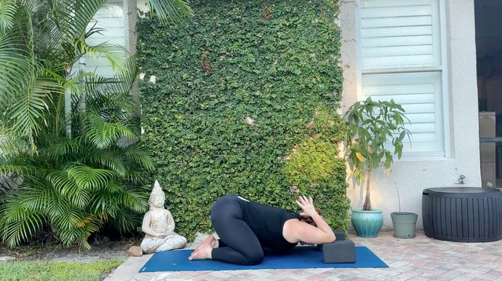 - Come to hands and knees with your hands on blocks. Sink your hips toward your heels, lower your forehead and chest toward the mat, and straighten your arms in Child’s Pose. Bend your elbows on the blocks and press your hands together in prayer position (anjali mudra) overhead. Stay here for 3-5 breaths.