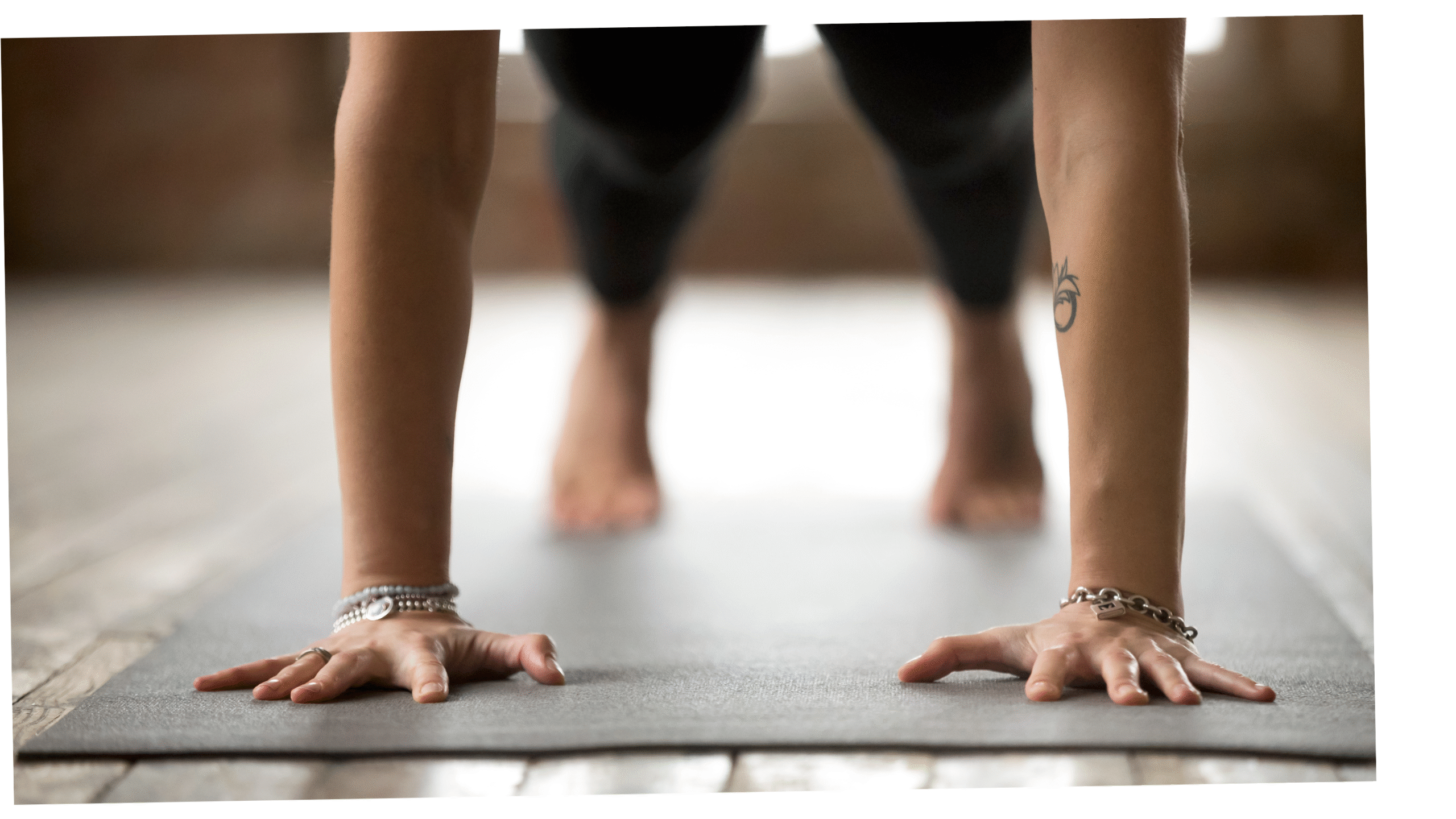 1. From hands and knees or Plank Pose, stack your shoulders over your wrists and ground down strongly through your palms into the mat.